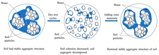 Dry–wet cycles cause a decrease in soil cohesion with a good aggregate structure and the bonding force between soil particles, a collapse of the internal particle structure, and a reduction in soil aggregation [12,15], which consequently leads to a decrease in the soil’s water holding capacity and nutrient composition, including soil moisture, electrical conductivity (EC), and soil’s ecological performance. High-performance ester materials can enhance the bonding force between soil particles, restore good particle structure, improve soil water holding capacity and soil aggregation [10], enhance the ability to store nutrients, increase soil’s EC, and improve soil’s ecological performance, as shown in Figure 1. This study conducted tests combined with numerical analysis to examine the changes in soil moisture and ecological performance from high-performance ester materials under dry–wet cycling conditions.