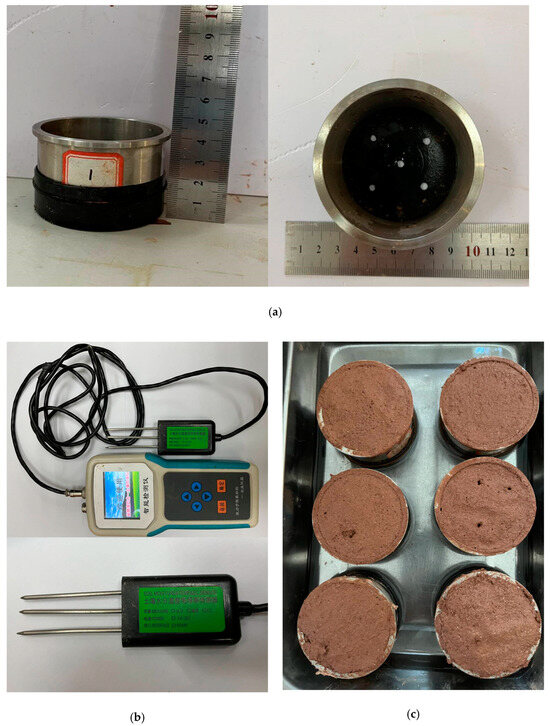 The equipment used for this dry–wet cycle test is shown in Figure 2, which mainly included a tray, a modified cutting ring device (as shown in Figure 2a), and a soil moisture EC detection instrument (as shown in Figure 2b). The 200 cm3 modified cutting ring covered the bottom to prevent a large amount of the soil sample from being lost during the dry–wet cycle, and holes were made in the bottom cover to allow the soil to absorb and dehumidify. The required parameters for soil moisture and the EC detector were obtained by inserting a sensor into the soil sample.