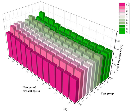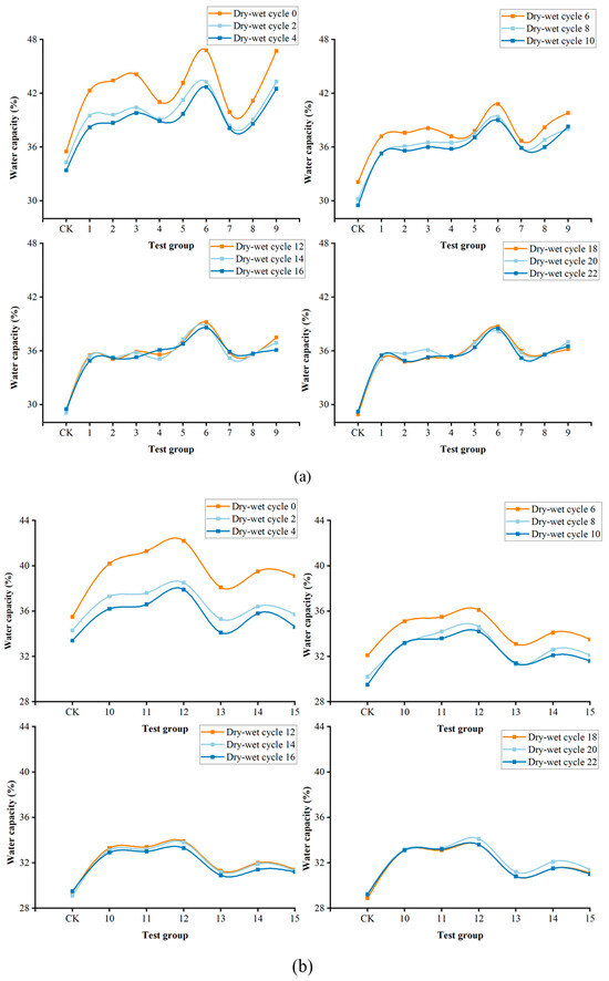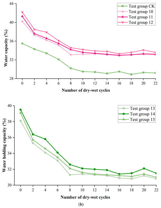 Polymer water-retaining materials can enhance the water retention and storage performance of soil, while polymer adhesive materials can enhance the bonding force between soil particles. Figure 5 shows the improvement effect of high-performance ester materials on soil’s water holding capacity; it can be seen that the water holding capacity of the test group with different material ratios under various dry–wet cycles is improved. Throughout all dry–wet cycles, the water holding capacity of the test group with added materials was higher than that of the control group without added materials. In test groups 1–9 with added materials, it was found that the soil’s water holding capacity increased with the increase of water-retaining materials, indicating that water-retaining materials played a key role in enhancing the soil’s water holding capacity. As the adhesive material increased, the water holding capacity of the soil increased at first, then decreased; the maximum value appeared in test group 6. Test groups 10–12 only contained water-retaining materials, while groups 13–15 only contained adhesive materials. As shown in Figure 5b, it can be seen that both materials can independently improve the soil’s water holding capacity; even after various dry–wet cycles, their water holding capacity is higher than that of the control group CK. As shown in the Figure 5, with the increase of water-retaining materials, the soil water holding capacity also increases. As the adhesive material increases, the soil moisture capacity first increases and then decreases. And from the graph, we found that the ester materials have an optimal ratio in improving soil’s water holding capacity.