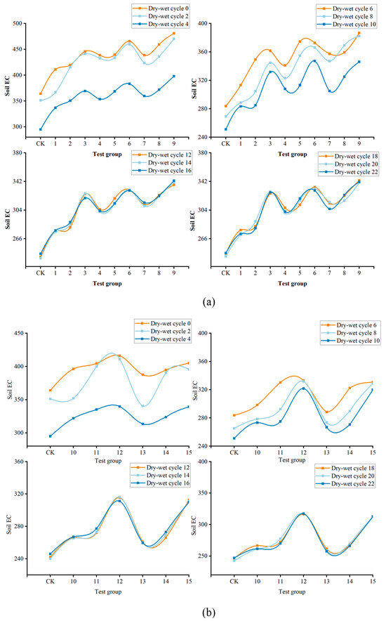 Response of high-performance ester materials to dry–wet cycles: soil EC improvement: (a) CK and test group 1–9: two polymer materials were added to the soil sample; (b) CK and test group 10–15: soil sample added with one polymer material.