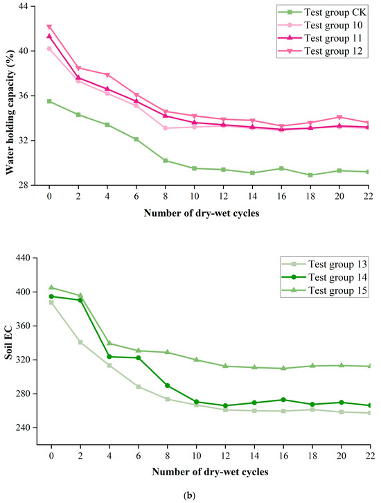 Dry–wet cyclesweaken the cohesion of soil, reducing the bonding force between soil particles. This leads to a deterioration of soil particle structure and a reduction in aggregation, which consequently leads to a decrease in the soil’s water holding capacity and EC. As shown in Figure 7, high-performance ester materials respond to the dry–wet cycle in terms of soil water holding capacity. It can be seen that as the dry–wet cycle progresses, the soil’s water holding capacity gradually weakens and then levels off, stabilizing around the 10th time. After various dry–wet cycles, the improvement effect of the ester materials weakened, but the test groups with high-performance ester materials always showed stronger water holding capacity than the control group without materials, and the material still performed an improvement effect. As the number of dry–wet cycles increased, the improvement in water holding capacity becomes more pronounced. Water-retaining materials improve the soil’s water holding capacity through their excellent water absorption and storage performance, which means that the soil still has sufficient moisture content after multiple wet–dry cycles. Adhesive materials enhance the bonding force between soil particles, allowing the soil to maintain a stable aggregate structure after multiple dry–wet cycles.