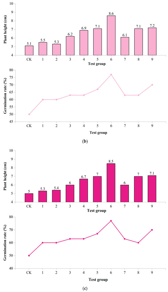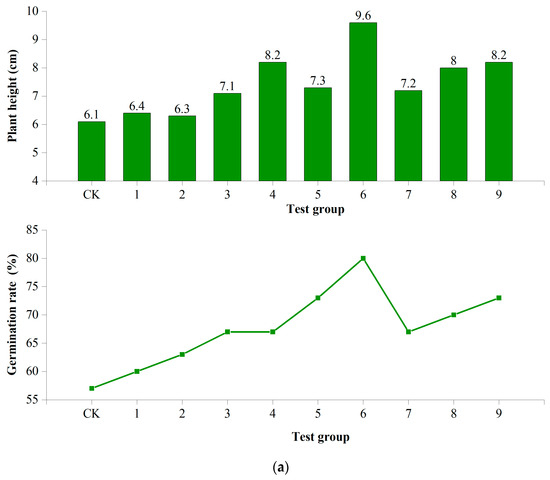 Observing the test groups 1–3, 4–6, and 7–9, it was found from the graph that with a certain quantity of polymer adhesive material mixed, plant germination rates increased as the quantity of polymer water-retaining material added increased; the more polymer water-retaining material mixed, the higher the soil’s moisture content was, which made the soil more conducive to plant sprouting. The plant’s height also increased from the addition of polymer water-retaining materials. As the added quantity of polymer water-retaining materials was invariant, the added quantity of polymer adhesive materials increased the germination rate and plant height, which first increased and then decreased. This indicates that using excessive polymer adhesive materials will have a negative effect on the plant’s germination and growth. Water-retaining materials and adhesive materials interact with each other in soil. Water-retaining materials play a role in increasing soil porosity and permeability. Adhesive materials can also affect the water holding capacity and EC of soil to a certain extent, but excessive adhesive materials can lead to strong soil particle adhesion, limit the expansion and water absorption of water-retaining materials, and lead to soil hardening and solidification.