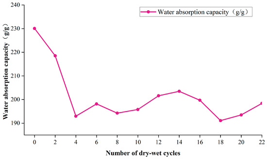 Figure 10 shows the response of polymer water-retaining materials to dry–wet cycles. After four dry–wet cycles, the water absorption performance of the water-retaining materials had decreased to a certain extent, but after multiple dry–wet cycles, the water absorption showed a tendency to stabilize and maintain a high level. It can be inferred that the decrease in water holding capacity and EC of the soil with materials caused by the dry–wet cycle is mainly due to changes in the soil’s structure. After the dry–wet cycle, the soil aggregate structure will undergo irreversible changes. With repeated dry–wet cycles, water softens the connections between soil particles [15], soil cohesion decreases, soil clay content decreases, coarse particles continuously decompose into fine particles, and large aggregates decompose. This is precisely the reason why the dry–wet cycle leads to a decrease in soil’s water holding capacity and EC, and a decrease in soil’s ecological performance.