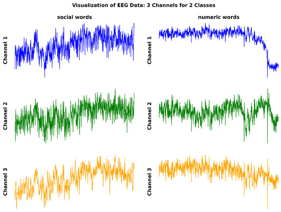 Figure 3 and Figure 4 show visualizations of the EEG data for eight and two classes, respectively. These figures demonstrate the rich temporal information captured by EEG, complementing the spatial information provided by fMRI.