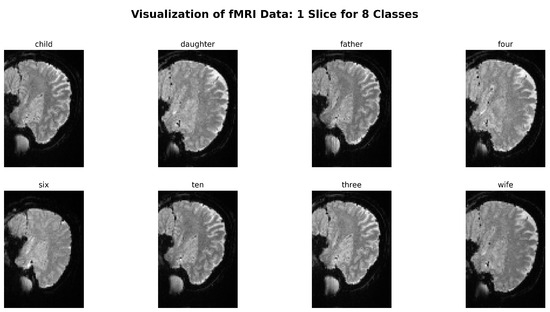 Figure 5 and Figure 6 present visualizations of the fMRI data for eight and two classes, respectively. These figures reveal distinct spatial patterns of brain activity for different inner speech categories, highlighting the potential of fMRI in capturing the neural representations associated with various inner speech tasks. The distinct patterns observed in both EEG and fMRI data underscore the potential of our multimodal approach in capturing complementary aspects of inner speech processes.