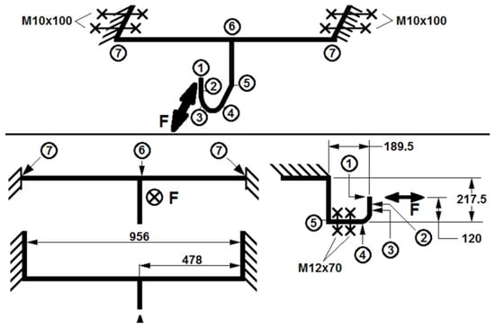The towing system is considered to be fixed to the vehicle chassis by the means of the 4 M10 x 100 bolts. The towing hook is also considered to be fixed to the structure of the towing system due to its attachment by the means of the 2 M12 x 70 bolts. The force F is parallel to the ground and is considered to be directed towards the center of the towbar ball, towards the vehicle (Figure 3). This force comes from the mechanical connection between the trailer and the pulling vehicle, and the value of the maximum force is calculated during sudden braking, depending on the mass of the trailer and the deceleration value of the vehicle–trailer combination. The mass of the trailer is of interest, because during braking, the trailer tends to push the vehicle due to inertia if the trailer is not equipped with its own braking system. A similar force occurs when the vehicle accelerates, with the trailer tending to hold the vehicle in place and the force being directed in the opposite direction to the direction of motion. The force exerted by the trailer during braking is greater than that when starting, because usually, the deceleration from braking is greater than the acceleration of the vehicle–trailer assembly [].