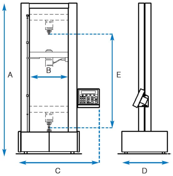 The LS 100 Plus testing machine. A, B, C, D, E represent the characteristic dimensions of the testing machine.