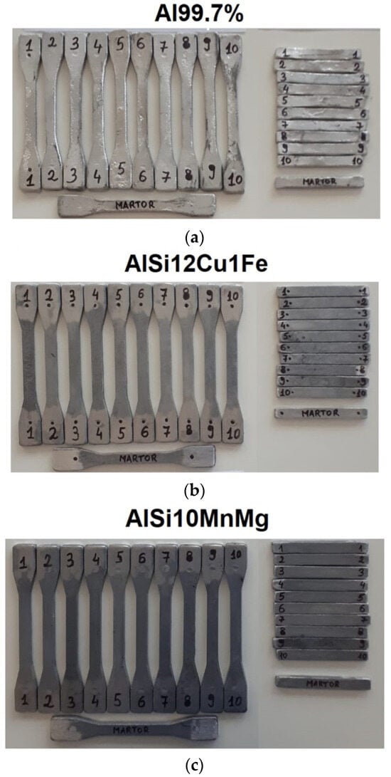 Tensile and bending specimens, made of (a) Al99.7%, (b) AlSi12Cu1Fe, and (c) AlSi10MnMg.