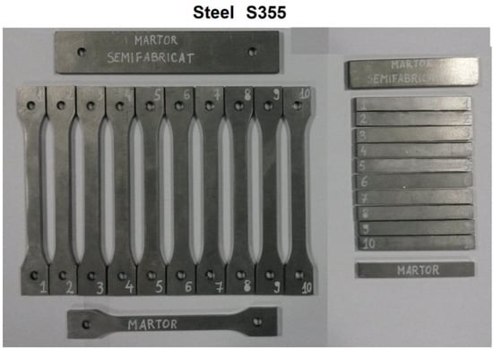 The grade of steel used in the manufacturing of the specimens was S355J2. The semi-finished product from which the samples were made was sheet metal with a thickness of 4 mm, cut by laser, and because this process thermally influenced the cutting area, producing a superficial tempering of the sheet, the cutting was made with additions of 5 mm on each side, additions that were later removed on a CNC milling machine to avoid a possible influence on the results of the experimental research on mechanical strength. Analogous for the specimens intended for the bending test, the holes at the ends of the specimens intended for the tensile tests had a purely technological role, to help fix them on the milling device in order to obtain the hourglass-shaped outer outline (Figure 6).