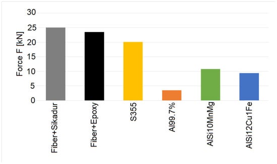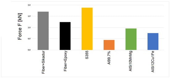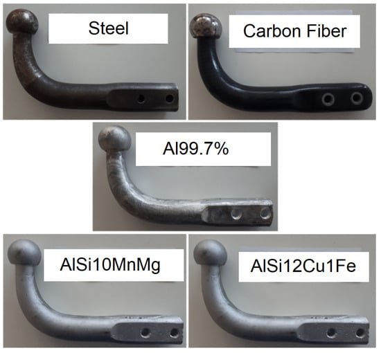 By far the best strength was shown by the steel towbar, but the CF towbar showed very advantageous behavior, with the breaking force being almost double the breaking force required for product validation. The AAl towbars came very close to the validation limit, with the AlSi10MnMg one passing the test and slightly exceeding the required force, while the other was more deficient, as were the specimens in that alloy, failing the test but being very close to the limit.