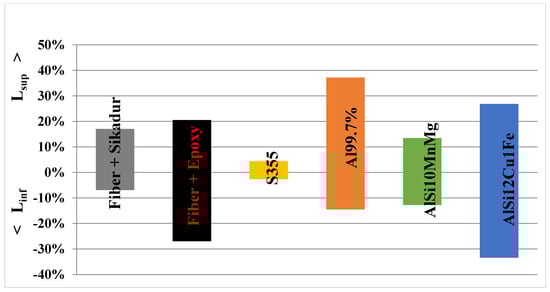 The specific mass (density, ρ [g/cm3]) of the materials varied according to the chemical composition of which they were made, and the density values of the materials studied in the present paper are shown in Table 2.