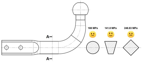 Following the results obtained in the previous sections, a more advantageous concept solution is proposed in terms of reducing the stresses in the critical area of the towing hook by changing its section geometry, keeping the same cross-sectional area for comparison (as an optimization element), but also the same volume of material corresponding to the reference towing hook.
