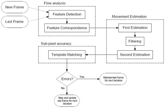 The proposed method follows the process illustrated in Figure 1 to calculate the VO. For each new frame, a flow analysis step is carried out to perform feature extraction and matching between these features and the ones in the previous frame. After this, the movement is estimated by minimizing the reprojection error of all key points using the least squares method. Finally, a template matching search is performed in a small area around the estimated movement, enabling sub-pixel accuracy for the algorithm.