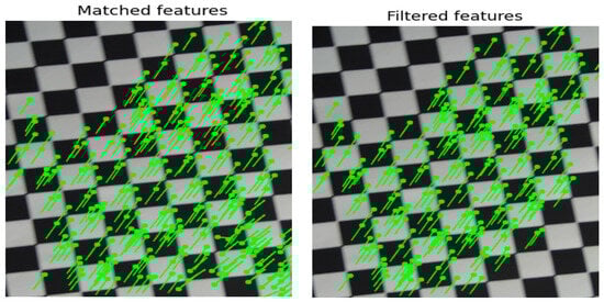 These calculations finally allow the transformation matrix in Equation (1) to be built. However, it is possible that some false correspondences were made in the flow analysis process, introducing an error into the VO. Therefore, a filtering process is employed. This procedure operates under the principle that all key points from one image must comply with the transformation matrix . Specifically, any point that does not align correctly will exhibit a significantly larger reprojection error with the transformation matrix compared to other points. Consequently, the proposed algorithm discards all points whose reprojection error exceeds the mean error by more than one standard deviation. The results of this process are shown in Figure 2, where a cluster of mismatched features in the lower right side of the image is removed after the filtering is applied. Finally, after the filtering process, the transformation matrix is recalculated.