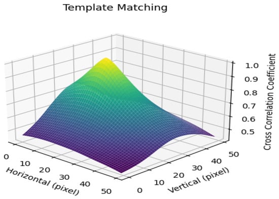 where represents the pixel value at fixed template T, and represents the pixel value of the moving template at . The algorithm will repeat this process for all pixels of the defined search area around , resulting in the one illustrated in Figure 4, whose maximum will be .