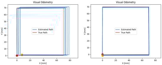 When the first tests of the algorithm were performed, it was observed that a constant drift was present, causing the estimated trajectory to consistently shift to the right. Specifically, the alteration produced all movements on the horizontal axis to the right to be magnified by a constant ratio. This issue is illustrated in the left side of Figure 7, where a test shows the estimated route followed by the camera after four loops were completed in a 70-mm square path. The initial pose is marked in red, and the final pose in orange. This drift is caused by the optic effects from the lenses, the image capturing and processing, and system set-up errors.