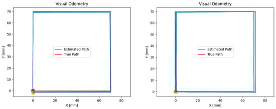 The system exhibited strong performance in both test scenarios, as evidenced by Figure 8. The estimated path of the algorithm aligned closely with the true 70 × 70 square path that the camera followed. Furthermore, the errors shown in Table 1 are minimal, even when the manual handling of the structure that held the camera is accounted for. Additionally, the performance of the robot in low-texture environments was proven with the tests using the tile pattern, which showed only slightly higher errors compared to the tests using the high-texture Aruco pattern.