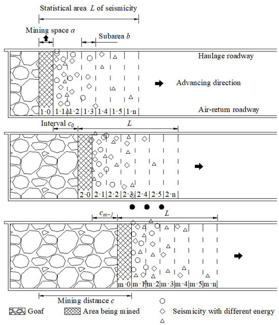 where and are the sums of the seismic energy and the seismic number in the advanced subareas, respectively; and are the total seismic energy and the total seismic number of a certain advanced subarea in all mining phases, respectively, and m is the number of the mining phases.