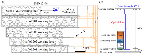 Layout of (a) working face 205 and (b) the deep borehole ZY1 with optical fiber for monitoring overburden strata strain.