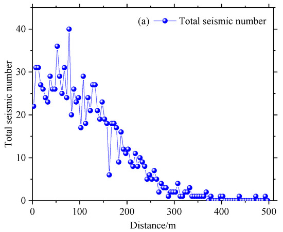 The mining-induced seismicity data from the eight phases were analyzed using the method described in Section 3. Figure 5 displays the curves of the total seismic number and the total seismic energy. Both curves generally follow the pattern of typical abutment stress before the working face, as shown in Figure 1. The seismic activity curves initially increase and then decrease as the distance from the working face grows. The peak seismic activities, including both the seismic number and the seismic energy, occur at a distance of 45–75 m ahead of the working face.