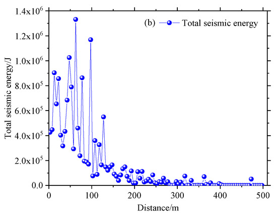 Statistical results of advancing mining-induced seismicity at working face 205. (a) Total seismic number, (b) Total seismic energy.