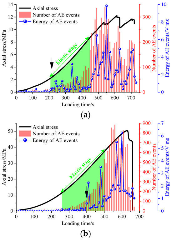 The AE activities of the coal and rocks under axial loading are shown in Figure 6. Notably, the number and energy of AE events are calculated every 10 s. It can be seen that the AE activities of the tested samples exhibit similar patterns. Specifically, the ratios of AE event numbers in the elastic stage to their peak value are 0.051, 0.084, and 0.094 for the coal, coarse sandstone, and medium sandstone samples, respectively, with a mean of 0.076. The ratios of the AE energy are 0.050, 0.040, and 0.066 of the peak value, respectively, with a mean of 0.052. These two mean ratios were used as thresholds to define the advanced mining influence ranges in terms of seismic number and total seismic energy.