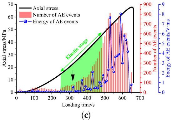 AE activity in coal and rock samples under axial loading. (a) Coal sample. (b) Coarse sandstone sample. (c) Medium sandstone sample.