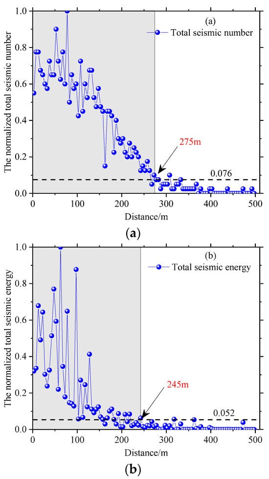 The normalized total seismic number and total seismic energy curves from Figure 5 are shown in Figure 7. It is evident that the advanced mining influence ranges are 275 m for seismic number and 245 m for seismic energy. Therefore, the advanced mining influence range for working face 205 during the mining period from 8 August 2020 to 4 January 2021 is 275 m.