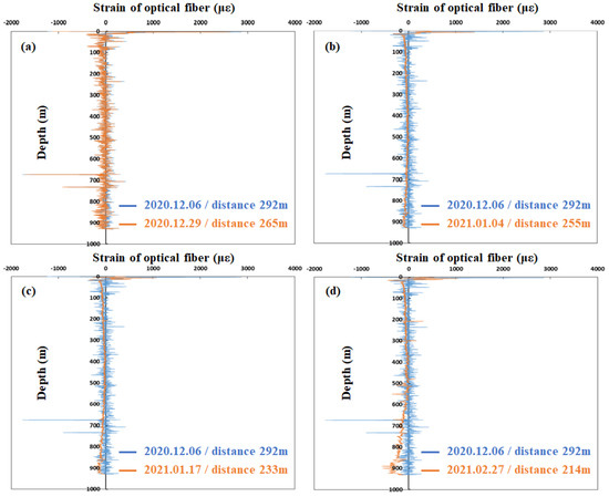 Strain curves of optical fiber in ZY−1 during the mining of working face 205. (a) on 29 December 2020, (b) on 4 January 2021, (c) on 17 January 2021, (d) on 27 February 2021.
