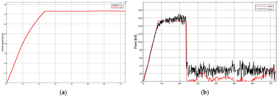 Graphical illustration of digital vehicle verification. (a) Vehicle speed, (b) power, (c) instant current drawn, and (d) motor torque.