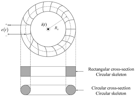 Last but not least, , , and are proportional to ; hence, shortening the length of the single-turn winding to simultaneously reduce these three parameters is favorable from the perspective of minimizing the stray capacitance. Since is approximately equal to the perimeter of the skeleton cross-section l, can be optimized by deliberate design of the cross-section of the skeleton of Rogowski coils so that is minimized.