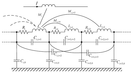 Generally speaking, the stray capacitances among non-adjacent turns of the winding are much smaller than those of the adjacent turns [19]. In order to simplify the network, the capacitances among non-adjacent turns are excluded, and a simplified network model of the stray capacitance of Rogowski coils is obtained, which is shown in Figure 6, where is the inter-turn capacitance of adjacent turns of the winding, and the capacitance of each turn and the shielding is denoted by . It should be emphasized that since the two turns located at the two ends of the winding are also adjacent in space, the inter-turn capacitance between them cannot be ignored.