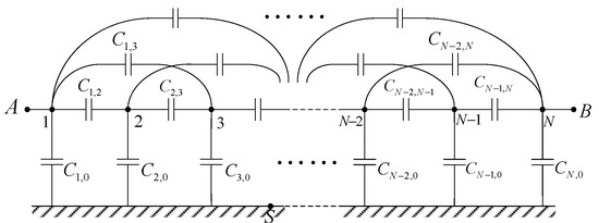 Based on Figure 4, the capacitance network of Rogowski coils is depicted in Figure 5, in which the edge effect of the winding at both ends is ignored [18]. In Figure 5, each marked node represents a single turn of the winding, and the grounding shield is modeled as a reference node S. The stray capacitance is defined as the lumped stray capacitance between the two terminal nodes A and B of Rogowski coils; thus, is referred to as hereinafter. After (N-2) times of the star-delta transformation, the intermediate nodes are eliminated step by step, and the π-type equivalent circuit of the stray capacitance network can be obtained, and the stray capacitance can be calculated accordingly. However, when the number of nodes is large, this approach is very cumbersome.