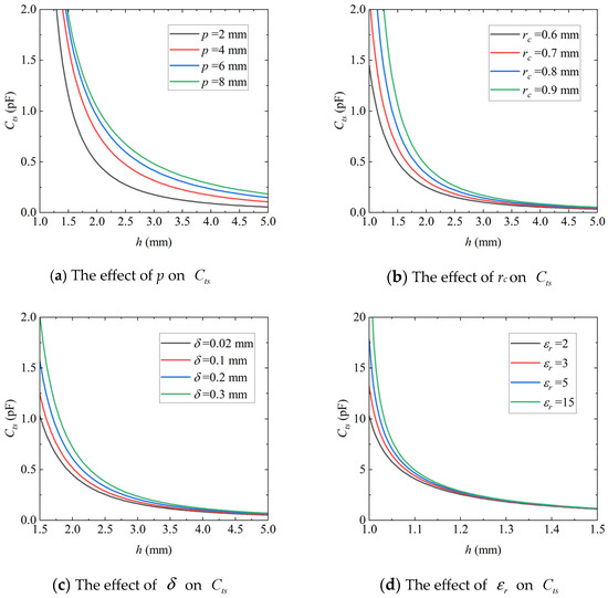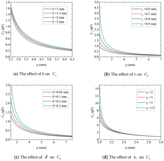 From Equation (10), it is obvious that is proportional to the length . The influences of h, rc, , and on Ctt are shown by Figure 9. It can be seen that under fixed , can be reduced by increasing the distance p among the adjacent turns, or decreasing h, , , and .