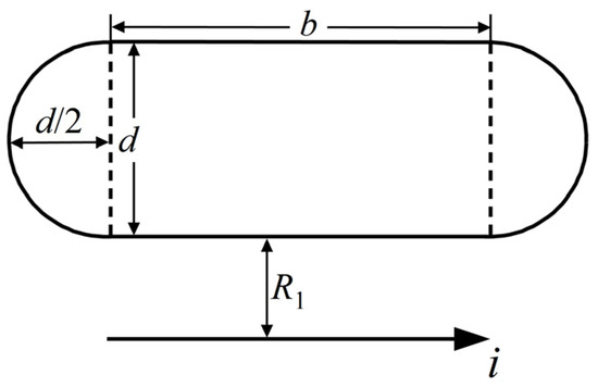 One of the anonymous reviewers reminded us of the fact that the adoption of rectangular cross-section imposes a sharp bending in the enameled-copper wire, inducing potential enamel rupture and wire shorting. Therefore, in practical applications, it is favorable to adopt shapes with rounded corners, referred to as oval cross-section. Figure 12 presents an example of oval cross-section, which consists of a rectangular domain and two half-circles. The magnetic flux through the oval cross-section is