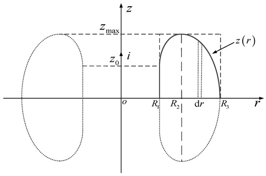 where is the magnetic permeability of the skeleton. Obviously, B is perpendicular to the z-r plane and independent of z; thus, the optimal cross-section should have an axis of symmetry perpendicular to the z-axis, which in our context is assumed to be the r-axis for convenience. As shown in Figure 11, only the upper half of the cross-section needs to be discussed, and the intersection points of its boundary and the r-axis are denoted by (R1, 0) and (R3, 0), respectively. Another point is that since the magnitude of B is proportional to 1/r, at least a portion of the boundary of the skeleton should lie on the straight-line r = R1 to yield as large magnetic flux as possible with unit perimeter. Assume that this portion is the line segment from (R1, 0) to (R1, z0). In the interval , the boundary z(r) should be a single-valued function. Based on the above discussions, obtaining the optimal skeleton cross-section can be attributed to the following tasks. In the interval , given the magnetic flux through the region surrounded by the curve z(r) and the straight line segment , find a curve z(r) with the shortest length.