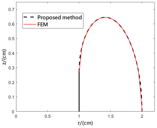 Then, the right-hand side of Equation (42) is evaluated via Gaussian integration to obtain the optimal skeleton cross-section of Rogowski coils, which is plotted in Figure 14. It is worth noting that instead of Equation (42), an alternative solution approach to the constrained variational problem, i.e., Equation (27), is the finite element method (FEM), which is more general yet troublesome to implement. Detailed implementation of the FEM solution to Equation (27) is included in the Appendix A, and the results are also presented in Figure 14. It is observed that the results via Equation (42) agree well with those obtained by the FEM; thus, the correctness and accuracy of Equation (42) is justified.