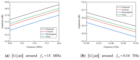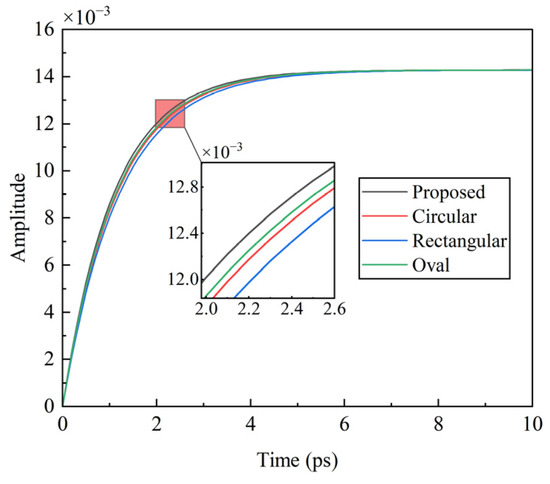 The frequency response around the lower cut-off frequency MHz and the uppercut-off frequency THz of the presented example are plotted in Figure 15a and Figure 15b, respectively. It is seen that in both low-frequency and high-frequency ranges, the proposed cross-section yields the highest transmission gain, while the rectangular cross-section exhibits the worst performance. To further evaluate the dynamic performance of the coils, Figure 16 depicts the step response of the self-integration coil. As expected, the proposed cross-section corresponds to the quickest response, indicating the largest overall bandwidth of this design. For comparison, the oval and circular cross-sections exhibit very close comparisons, while the rectangular cross-section leads to the longest rising time and thus the most unfavorable performance.