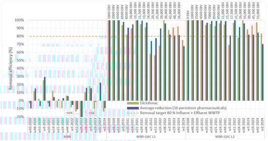 Removal efficiencies for at least four and two substances from categories 1 (amisulprid, citalopram, metoprolol, and venlafaxine) and 2 (benzotriazole and 4- and 6-methylbenzotriazole), respectively, according to the proposed sewage directive, were investigated in the last two sample campaigns. Results indicated a moderate negative removal of −30 to −40% in the MBR process but a total removal over MBR-GAC L1 and MBR GAC L2 of 80–92%, even in the last occasion at 56,000 and 52,000 treated EBVs for L1 and L2, respectively.