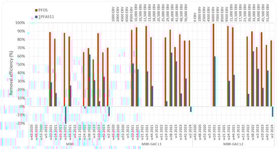 Removal efficiency in the MBR-GAC pilot for all analyzed PFASs (∑PFAS11) and only PFOS for sample occasions (calendar week and treated EBVs).