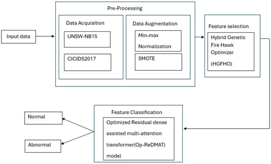 With the introduction of software-defined networks, smart homes, and the IoT, today’s computer networks and the applications that connect to these devices have experienced unprecedented growth. However, the possibility of network intrusions has also gradually increased, providing a constant risk to network infrastructures. These attacks aim to destroy availability, confidentiality, authority, and integrity, which are the primary basis of computing systems. A particular optimized transformer model has been utilized for network intrusion detection mechanisms to detect cyber-attacks. Initially, min-max normalization was employed to eliminate the effect of a maximum or minimum value on the main characteristics. Secondly, to solve the inadequate minority attack detection efficiency resulting from an imbalance in training data, the synthetic minority over-sampling method utilizes a data augmentation mechanism. Furthermore, feature selection was performed using Hybrid Genetic Fire Hawk Optimizer (HGFHO) to select the optimal subset of features. In the classification phase, optimized residual dense-assisted multi-attention transformer (Op-ReDMAT) models were developed to identify network cyber-attacks. Here, input data is collected from two publicly available datasets: UNSW-NB15 and CICIDS2017. Figure 1 illustrates the block diagram of the proposed methodology.