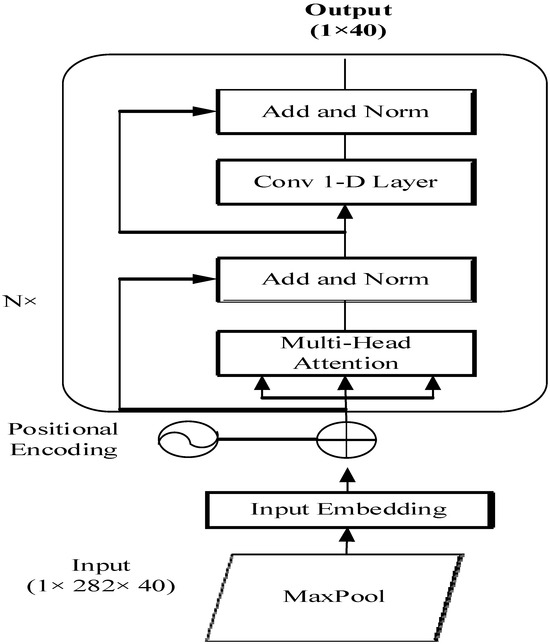 The scaled dot product for the sequence output at the time step was scaled by the hidden state dimension . Numerous self-attention techniques can be utilized. This allows multi-head self-attention (MHSA) to estimate an over-term with a different weight dependent on a subspace of the input sequence. Multiplying and combining the output from each attention head incorporated with a weight matrix can minimize the encoded state dimensions. Instead of utilizing a single feed-forward layer as the transformer encoder in this study, the number of attention heads Conv-1D operates on stored latent space. The mathematical representations for estimating a softmax prediction are expressed in Equations (14) and (15):
