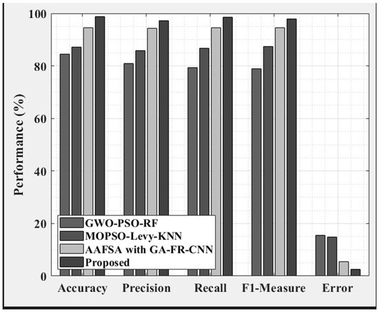 The comparison between the existing and proposed methods in terms of precision, accuracy, recall, error, and F1-measure is demonstrated in Figure 4. The proposed method is compared with MOPSO-Levy-KNN and AAFSA with GA-FR-CNN and GWO-PSO-RF. The existing GWO-PSO-RF attained a meager F1-measure value of 79.0%, respectively. However, the model had a low-quality solution and high complexity. The existing MOPSO-Levy-KNN achieved a higher F1-measure value of 87.3%, respectively. As a result, the existing MOPSO-Levy-KNN had storage and memory issues for large datasets. The existing AAFSA with GA-FR-CNN attained a higher recall value of 94.5%. However, the existing model affected the network’s convergence rate on the error surface. The existing GWO-PSO-RF attained a high error value of 15.54, respectively. However, the existing GWO-PSO-RF model failed to detect cyber-attacks.