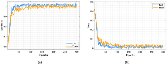 Figure 10a,b illustrates the accuracy and loss curve analysis. The accuracy values gradually increase to 50 epochs, so the model attains high accuracy. When calculating the loss function, the testing loss is high, from 0.1 after 50 epochs, and the training loss is below 0. Thus, the proposed model consumes less time for training and testing.