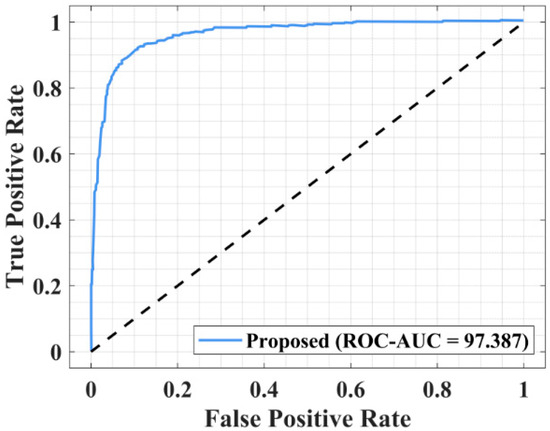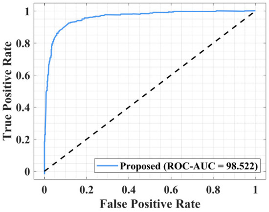 The implications of these results, coupled with the findings presented in Figure 9 and Figure 10, are that the proposed model outperforms existing models with a true positive rate of 0.9982 and a false positive rate of 0.028. The ROC curve, with an AUC of 97.38%, also proves the model’s high effectiveness in differentiating between actual threats and false alarms. Thus, the proposed model proves to be highly effective in detecting cyber-attacks with high accuracy and reliability, and it ensures a highly effective solution for eradicating the drawbacks of the conventional models.