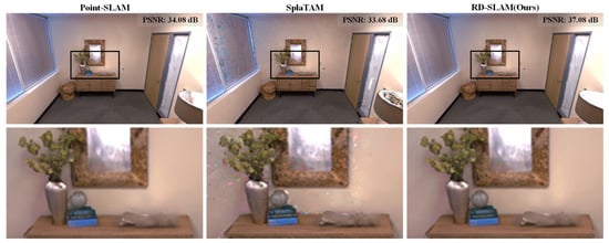 During our study, we found that the performance of RD-SLAM depends on the quality of RGB-D images, and the system’s effectiveness may be compromised with poor camera quality or in environments where high-quality images are unavailable. Methods such as [,] can quickly reconstruct high-quality images with their lightweight and efficient modeling architecture. We plan to construct image pyramids that are first optimized for 3D Gaussian using low-resolution images captured by the camera and then supervised using reconstructed high-resolution images as truth values. We hope to use the above methods in future work to reduce the effect of low-quality input images and improve the robustness of the system.