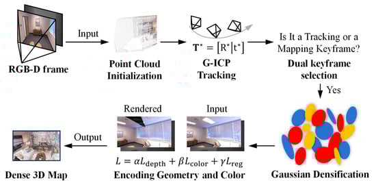 3D Gaussian splatting (3DGS) [] has more potential for dense map representation due to its high-fidelity rendering quality and hundreds of times faster rendering than NeRF. In addition to faster rendering, 3DGS-based scene representation enables the direct editing of the scene, which is essential for numerous downstream operations. 3D Gaussians are differentiable volumetric representations that are simultaneously unstructured and explicit and can be rasterized very efficiently by projecting them to 2D. With these advantages, 3DGS can be well applied to online SLAM systems with real-time requirements. Nevertheless, most extant 3D Gaussian-based SLAM systems [,,,] employ photometric error techniques to ascertain the optimal pose through iterative minimization of the error between the rendered and input images. This approach has the consequence of significantly constraining the system’s real-time performance. Based on this, we use the generalized iterative closest point (G-ICP) [] to replace the photometric error technique in position estimation and use a simple and efficient 3D point cloud fast tracking method to improve the system’s operation speed and tracking accuracy.