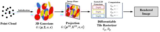 - Kerbl, B.; Kopanas, G.; Leimkuehler, T.; Drettakis, G. 3D Gaussian Splatting for Real-Time Radiance Field Rendering. ACM Trans. Graph. 2023, 42, 1–14. [Google Scholar] [CrossRef]