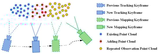 Since 3D Gaussian needs good observation coverage and considering the densification strategy, we divide the keyframes into tracking and mapping keyframes, as shown in Figure 4. We use G-ICP to calculate the match ratio of the current frame point cloud to the map point cloud. The frame is selected as the tracking keyframe if the matching ratio is below the threshold. If the relative rotation of the current frame to the latest keyframe is above the threshold, the frame is selected as the mapping keyframe. The relative rotation here is expressed using Euler angles, and to ensure the stability of the results, we add the Euler angles on the three axes and compare them to a single threshold. In the tracking keyframes, only 3D Gaussians that do not overlap with the existing map are added to the optimization. The opposite is true in the mapping keyframe, where only 3D Gaussians that overlap with the existing map are added to the optimization.