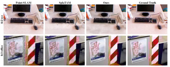 The visualization results in Figure 6 show that RD-SLAM can generate higher quality and more realistic images than previous SOTA methods, avoiding ghosting and local reconstruction errors. From the rendering results, Point-SLAM is too smooth to reconstruct fine details, and SplaTAM produces more apparent holes in some areas, as shown in the second, fourth, and sixth rows of Figure 6.